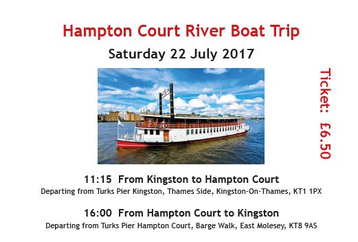 We have a few tickets left for a Kingston – Hampton Court boat trip on Saturday 22 July. The details are shown below. If you’d like to come please sign up as soon as possible. Tickets will be sold on a first-come-first-served basis. Further information from Dodie Khurshid or the church office (office@trinitywimbledon.org).