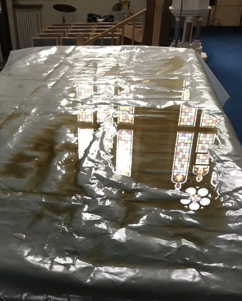 …..here’s the proof after a day and night of rain!  Reflections in puddles on the Communion table.