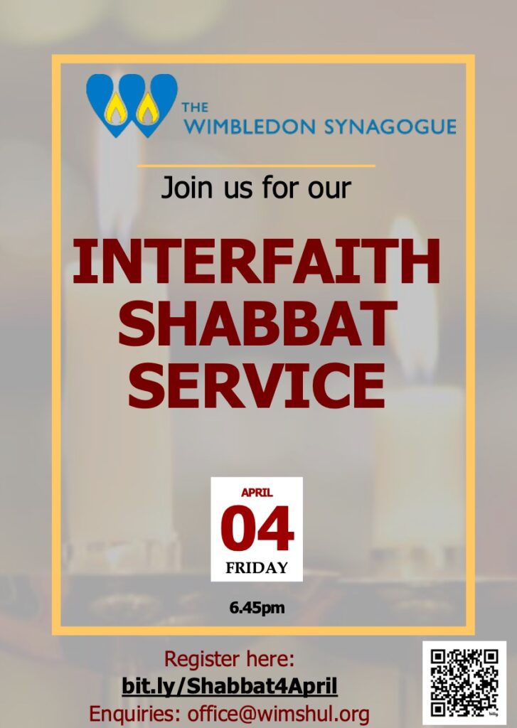 We are invited to a special Interfaith Shabbat Service at Wimbledon Synagogue on Friday, 4 April at 6.45pm.