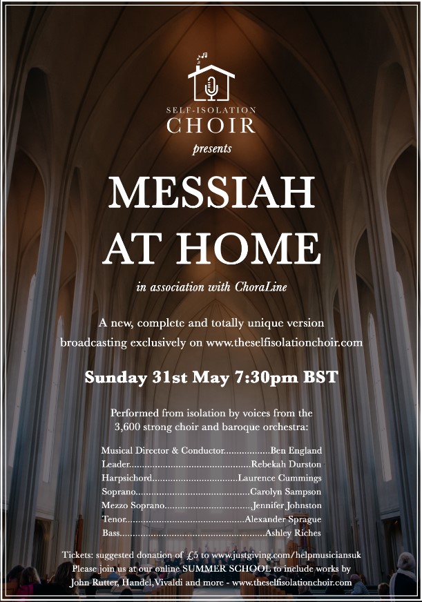 Since ‘lockdown’ over 3,600 singers from all over the world have been rehearsing and recording tracks for a new and unique version of Handel’s Messiah for broadcast exclusively this Sunday 31 May at 7.30 pm on www.theselfisolationchoir.com
