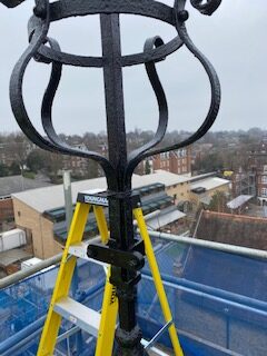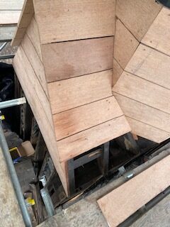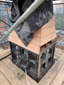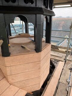 On the rear flèche timber replacement work is complete. Decoration works are now taking place.