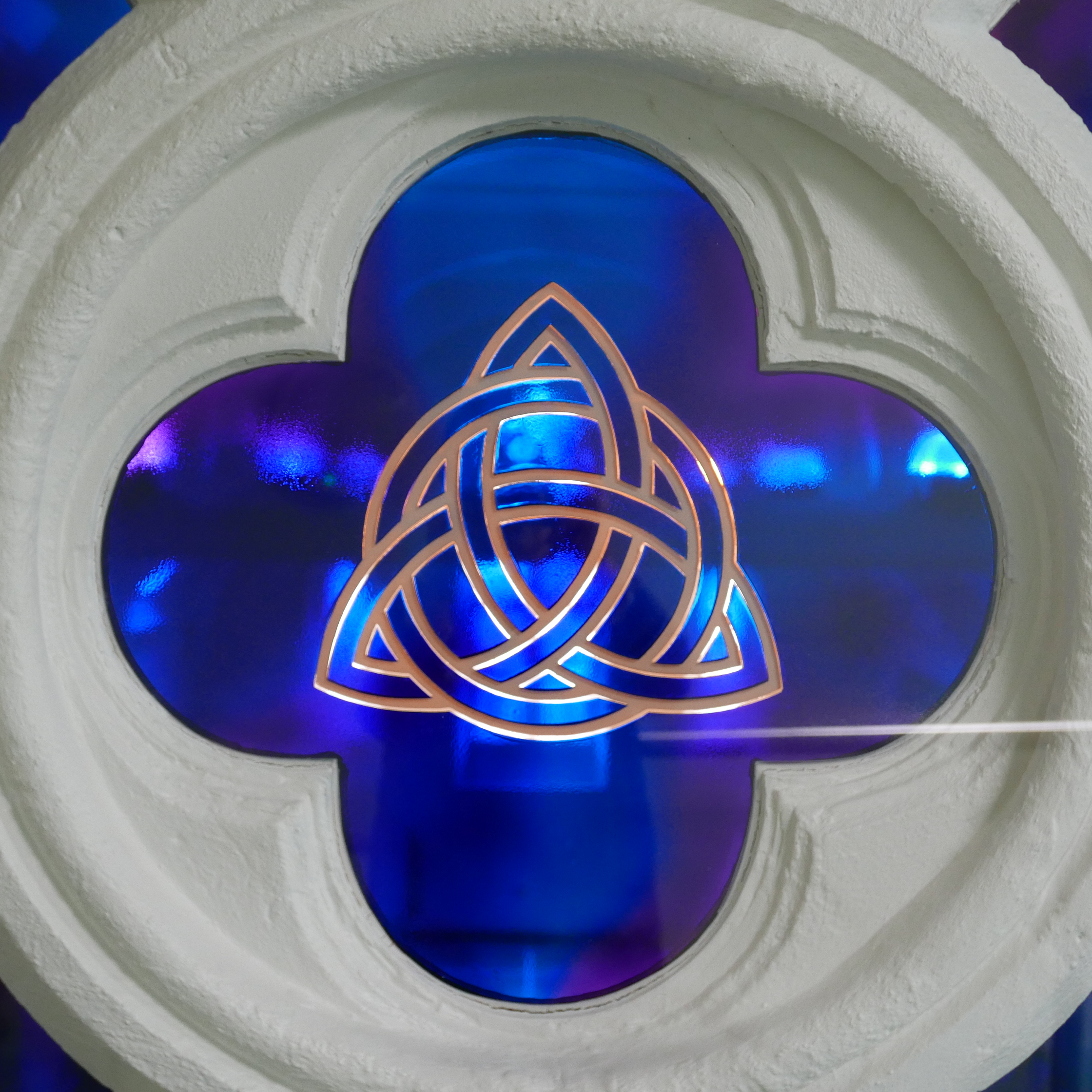 The window is manufactured with hand sprayed coloured resin, with the central triquetra (Trinity symbol) design sandblasted onto the glass.